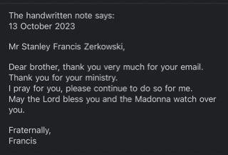 On Friday, October 13, I received a handwritten note from Pope Francis, thanking us for our efforts. After sharing this with Bishop John, he indicated it should be made public.