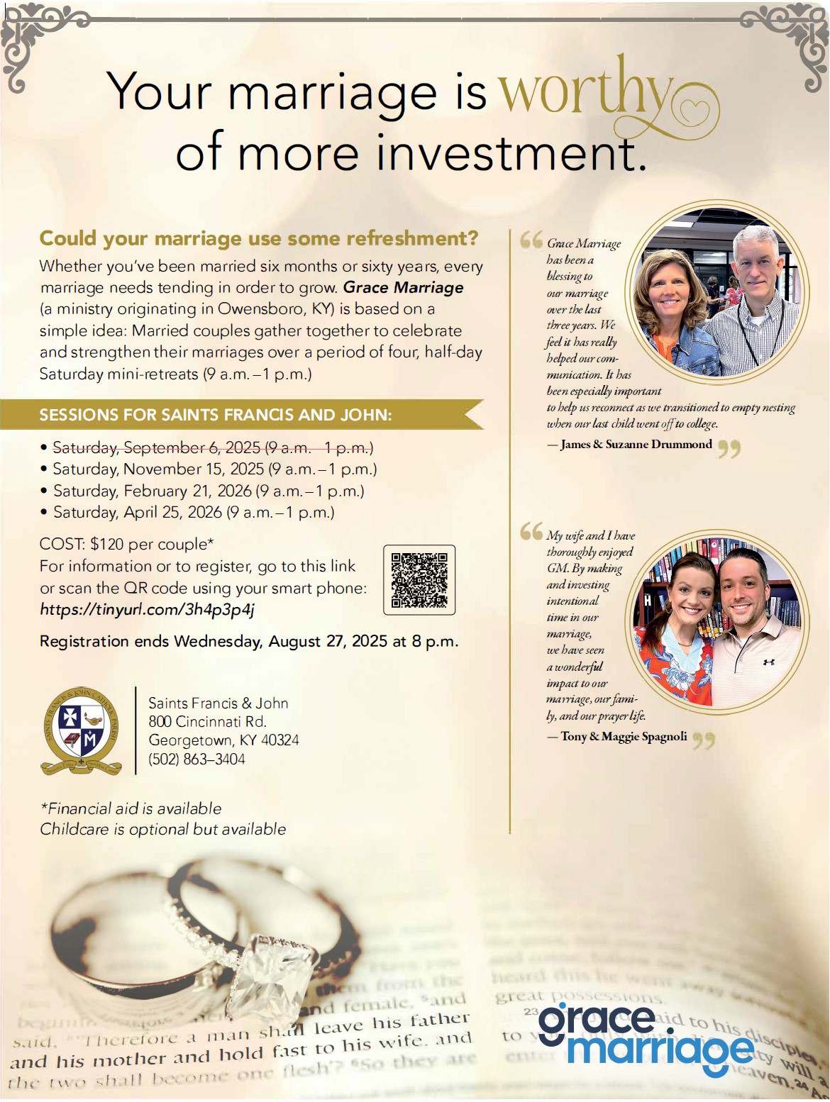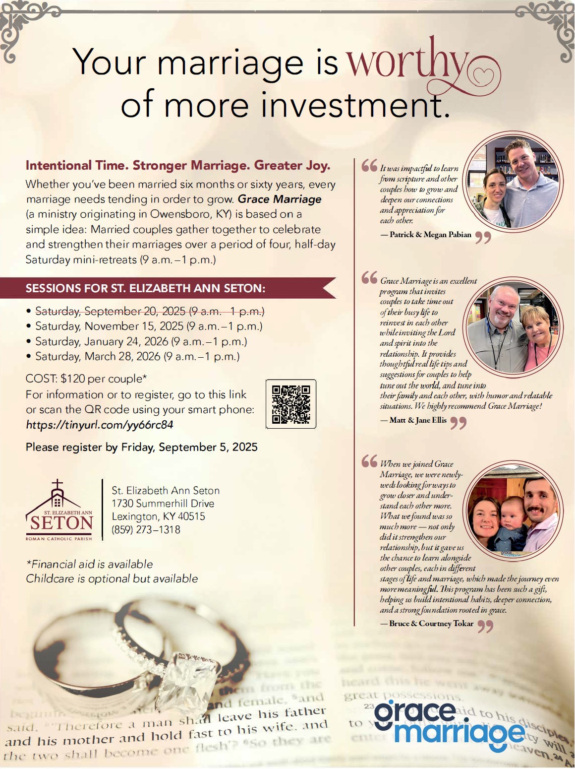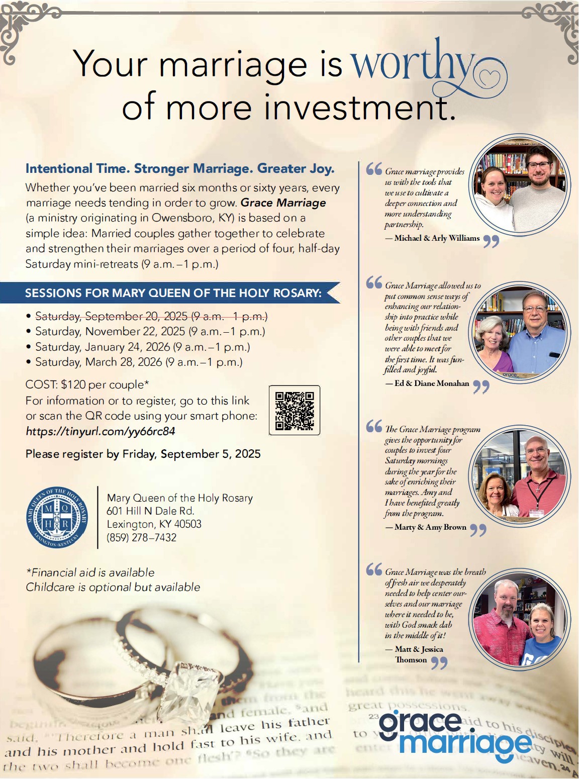 During the 2025-26 school year, Grace Marriage will be offered by three different parishes in the Diocese of Lexington. See below for registration link.